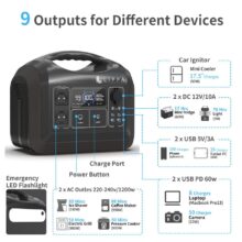 Men det slutter ikke her! Du får tre utroligt alsidige opladningsmetoder pakket ind i én lille pakke; AC-vægstik, solpanel og bilstik for ultimativ bekvemmelighed, der ikke kan matches af nogen. Med to stikkontakter på 1200 W med 3600 W peak for maksimalt output sammen med to USB-A-udgange, der kan nå op på maks. 18 W pr. port plus et cigarstik med 120 W maks. output – er der intet, du ikke vil kunne gøre. Og endelig sørger to USB-C-porte (PD 60W og 18W) for, at du kan oplade laptops, tablets og mere uden problemer.