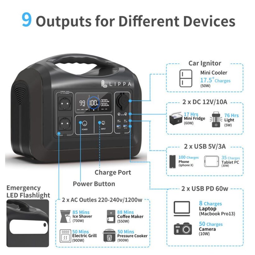 Vi præsenterer Lippa Power Station 992 Wh – en innovativ, pålidelig og kraftfuld løsning på dine energibehov. Denne imponerende enhed har hele 992 Wh bærbar strøm og har nok juice til at understøtte op til ni enheder på én gang – hvilket gør den fantastisk til både kort og langvarig brug. Ud over rå kraft sikrer geniet bag designet også, at din oplevelse er problemfri og effektiv med sin fremragende beskyttelse mod overstrøm, overspænding og overtemperatur.